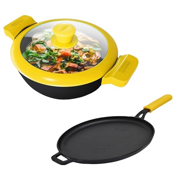 GEMMA Cookware Combo of 2, Cast Iron Kadhai with Glass Lid and Dosa Tawa